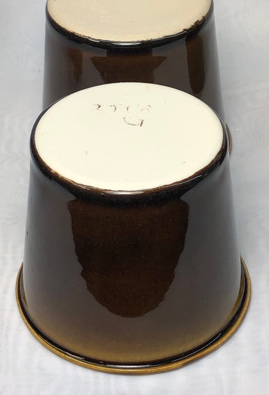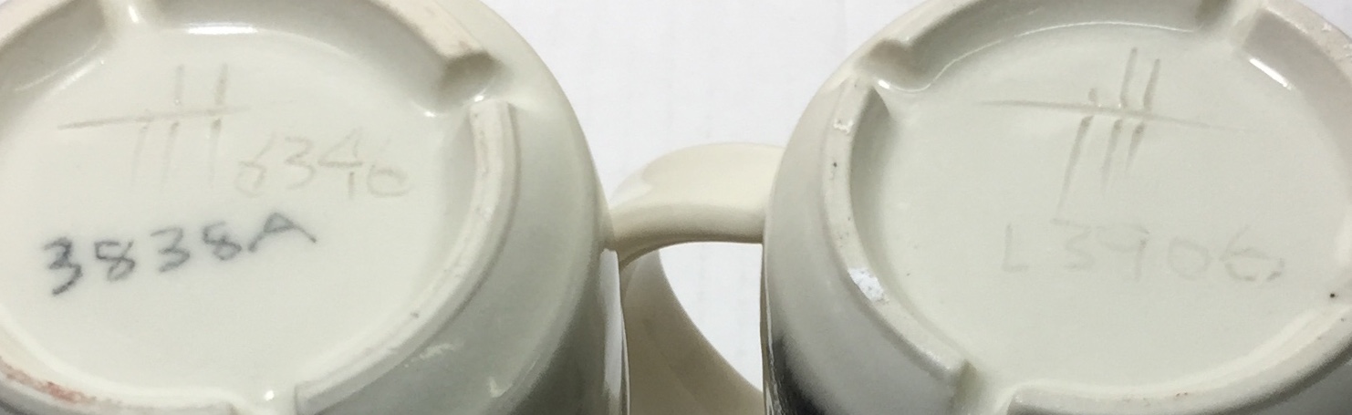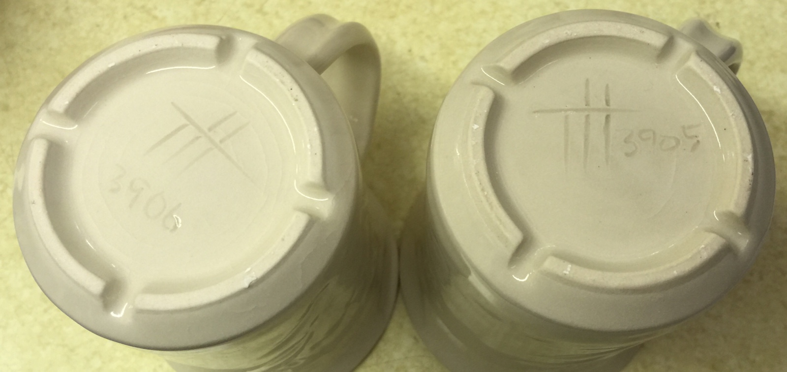On P300 test mix (made with Pioneer kaolin, left), 370 next recipes. Neither crazed on the sidewalls. But P300 crazed on the bottom (as shown). P300 using Pioneer kaolin - mug bottom