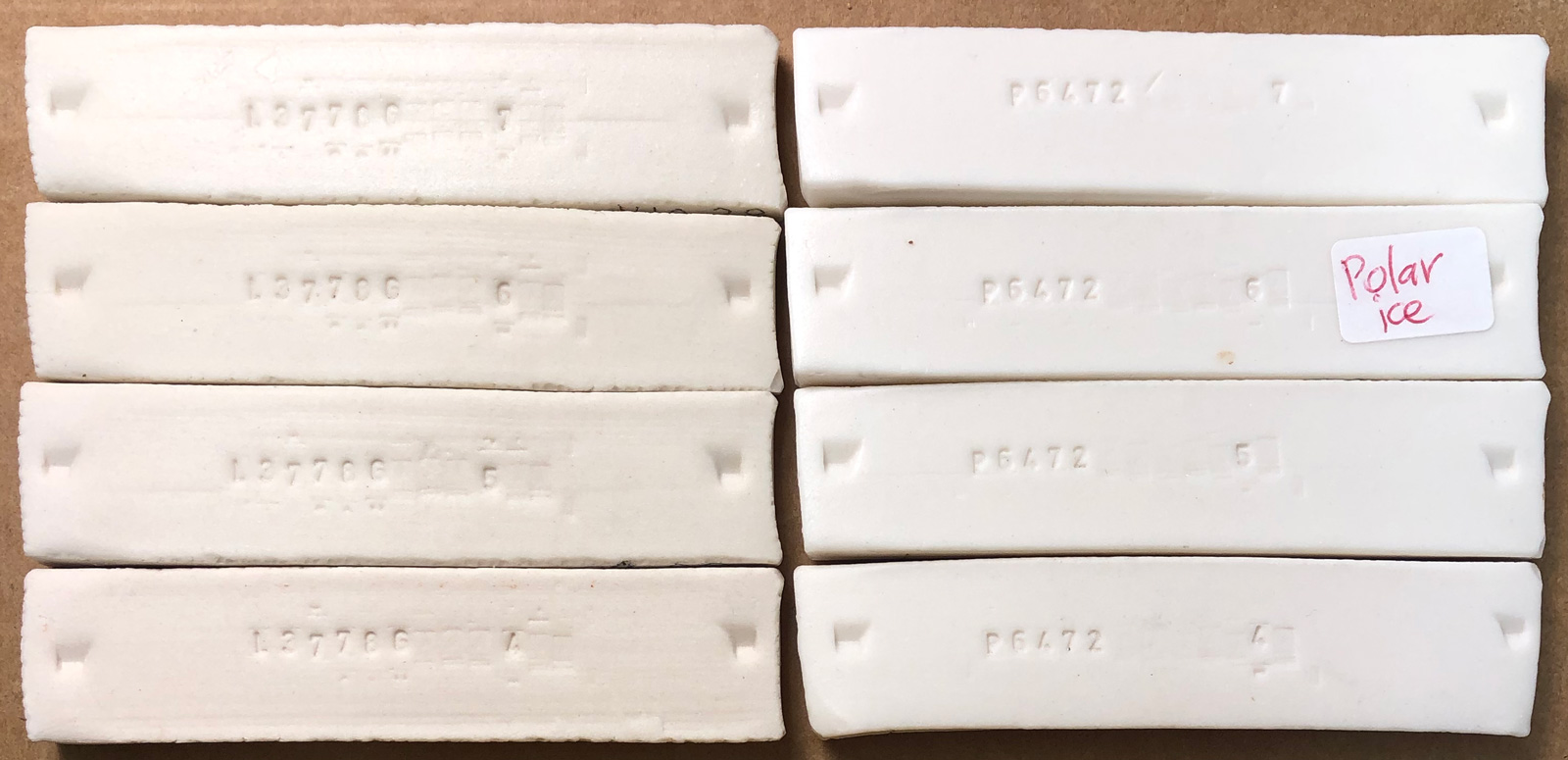 Fired from cone 8 to 4 (top to bottom). Typecodes MAS-Master Ticket Testdata SHAB - Shrinkage/Absorption